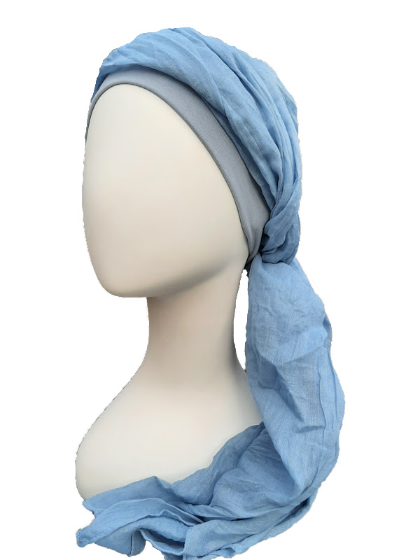 The New Delhi is a beautiful scarf hat in which the chemo hat, under the scarf, is made of