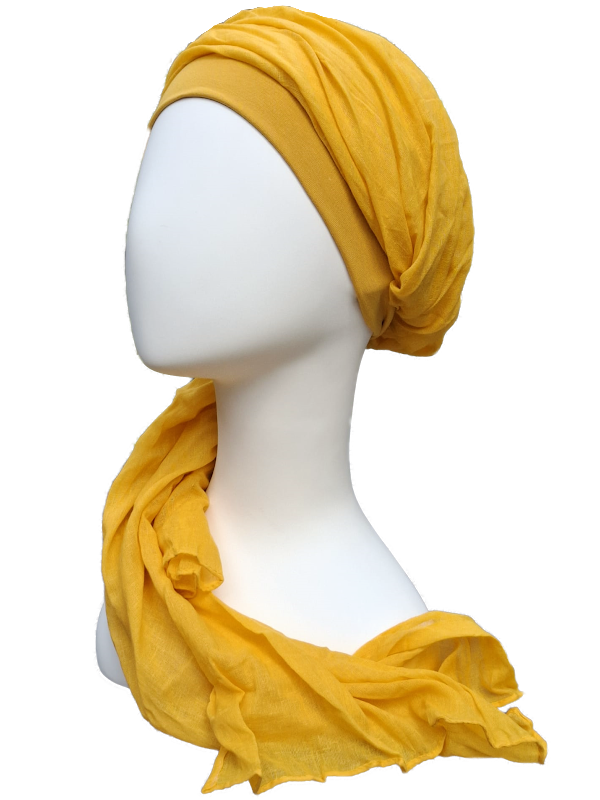 The New Delhi ND1706 Ocher is a beautiful scarf hat where the chemo hat, under the scarf, is made of Cotton fabric to which a beautiful scarf is sewn.